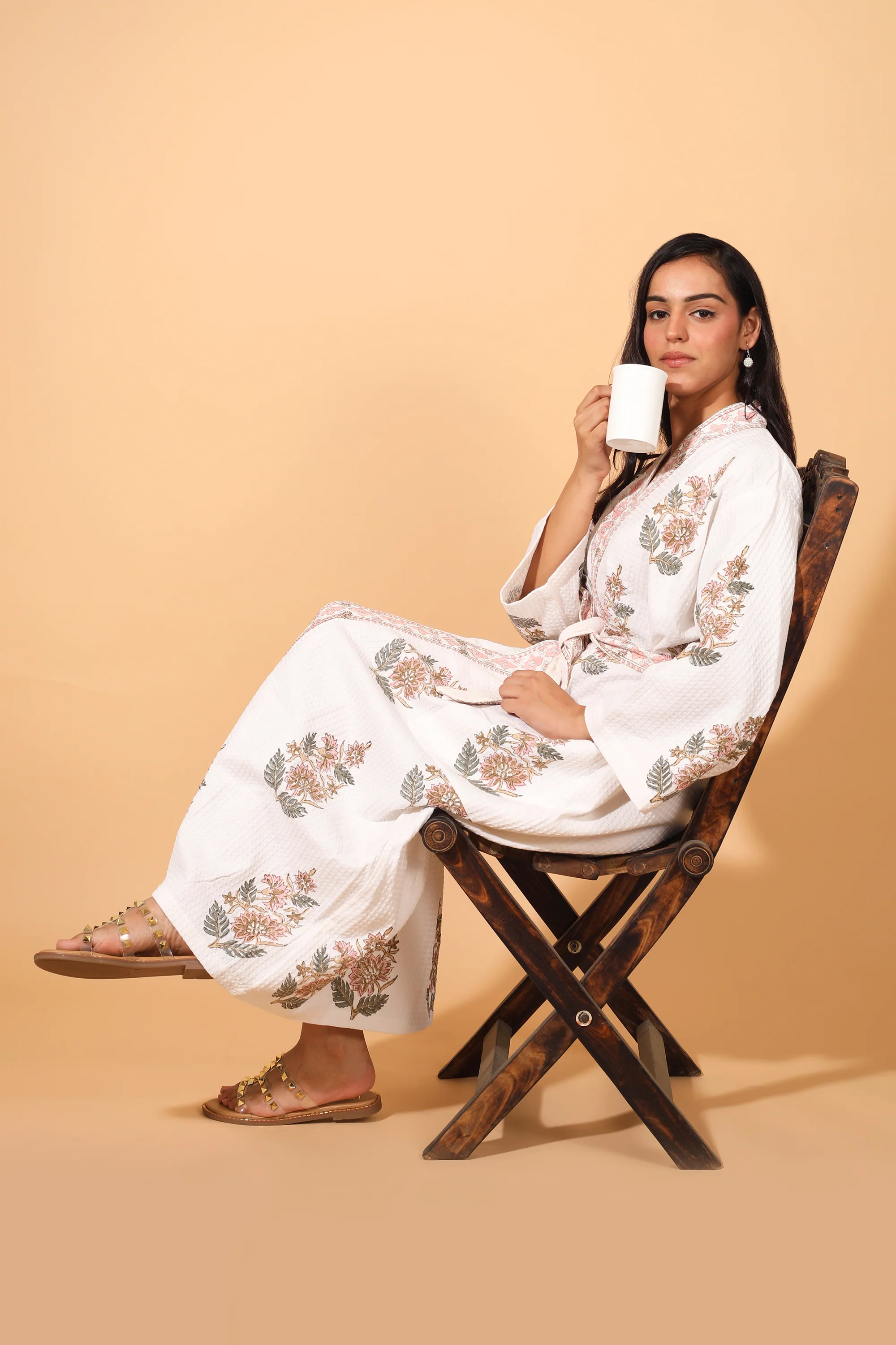 Block print Waffle Cotton bath robes for women - Peach Blush