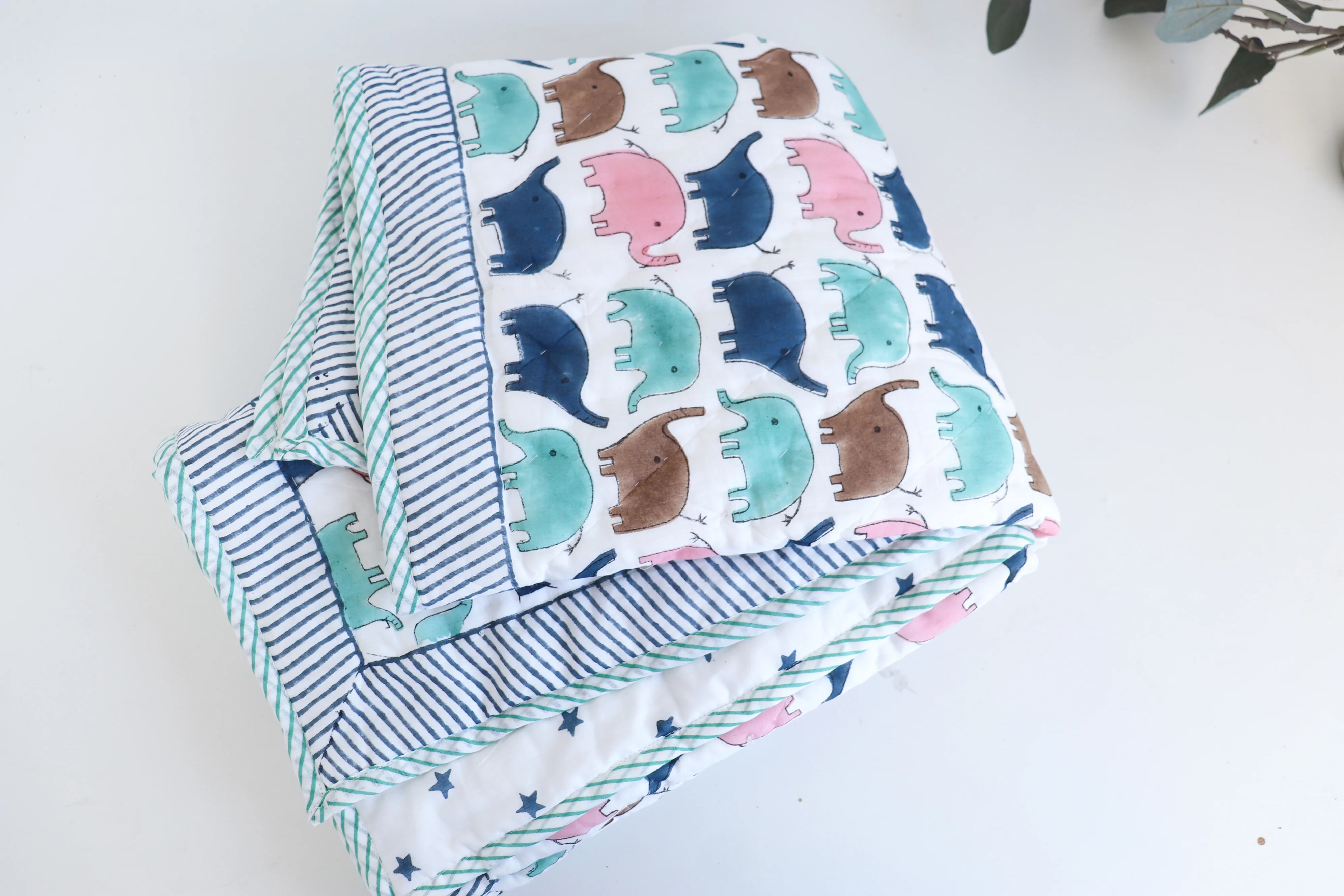 • Hand block printed elephant design — playful and timeless